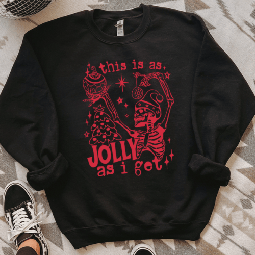 Get festive the spooky way with our “This Is As Jolly As I Get” gothic Christmas sweatshirt. Featuring a skeleton celebrating the season in blood-red print, it’s perfect for dark humor lovers who prefer bats over bells. Cozy, creepy, and ideal for alternative holiday outfits. Keywords: gothic Christmas sweatshirt, spooky holiday sweater, dark humor Christmas shirt, skeleton Xmas pullover, goth Christmas gift.